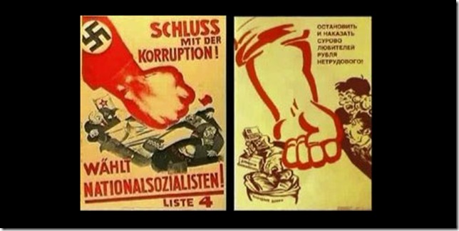 Пропагандите плакати на Германската Работническа Национал-социалистическа партия (ГРНСП) и на Комунистическата Партия на Съветския Съюз (КПСС), си приличат като две капки вода. Ако бяха правени сега, бихме казали, че са работа на една и съща рекламна агенция, която е прибрала парите и на двамата конкуренти. Разбира се, тази прилика въобще не е случайна.